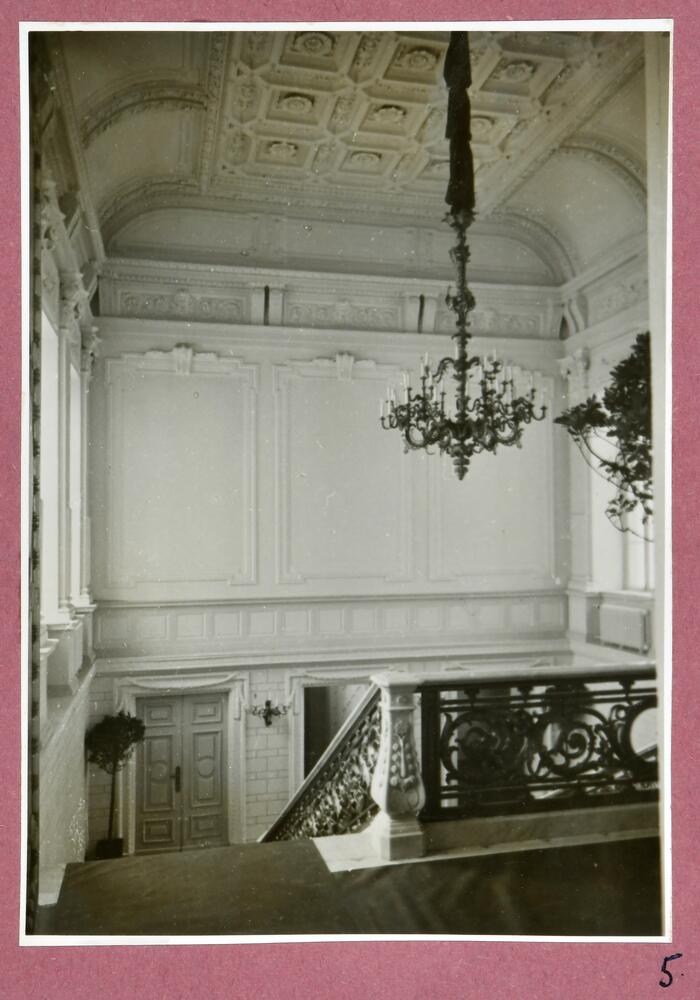 Latvijas PSR Augstākās padomes ēkas Komjaunatnes ielā 11 kāpņu telpa (tagad - Latvijas Republikas Saeimas ēka, Jēkaba ielā 11). Augusta Roberta Pflūga un pirmā akadēmiski izglītotā latviešu arhitekta Jāņa Fridriha Baumaņa projekts. Neorenesanses un neobaroka siena un griestu apdare un svečturis.