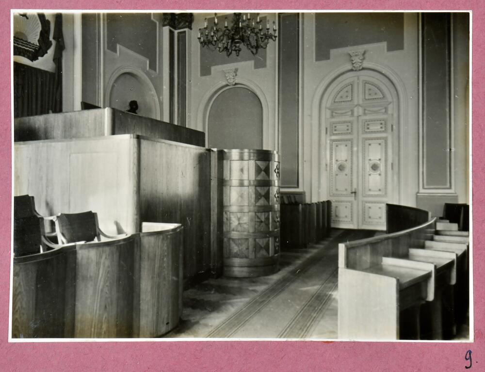 Latvijas PSR Augstākās padomes ēkas Komjaunatnes ielā 11 (tagad - Latvijas Republikas Saeimas ēka, Jēkaba ielā 11) sēžu zāles ozolkoka tribīne jeb deputātu sektors un durvis uz dzelteno zāli. Augusta Roberta Pflūga un pirmā akadēmiski izglītotā latviešu arhitekta Jāņa Fridriha Baumaņa projekts. Sēžu zāles interjers veidots pēc Eižena Laubes 1922. gadā piedāvātā projekta pēc 1921. gada ugunsgrēka.