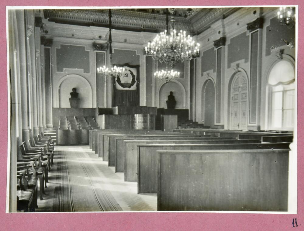 Latvijas PSR Augstākās padomes ēkas Komjaunatnes ielā 11 (tagad - Latvijas Republikas Saeimas ēka, Jēkaba ielā 11) sēžu zāles interjers. Augusta Roberta Pflūga un pirmā akadēmiski izglītotā latviešu arhitekta Jāņa Fridriha Baumaņa projekts. Sēžu zāles interjers veidots pēc Eižena Laubes 1922. gadā piedāvātā projekta pēc 1921. gada ugunsgrēka.