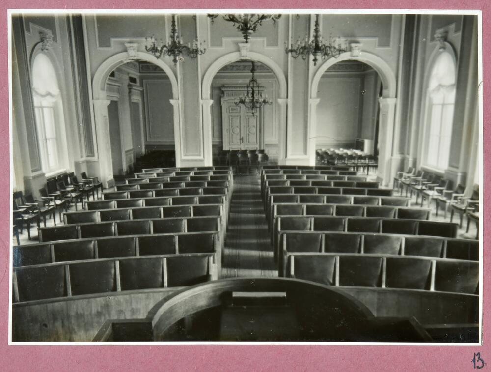 Latvijas PSR Augstākās padomes ēkas Komjaunatnes ielā 11 (tagad - Latvijas Republikas Saeimas ēka, Jēkaba ielā 11) sēžu zāles interjers. Skats no tribīnes. Augusta Roberta Pflūga un pirmā akadēmiski izglītotā latviešu arhitekta Jāņa Fridriha Baumaņa projekts. Sēžu zāles interjers veidots pēc Eižena Laubes 1922. gadā piedāvātā projekta pēc 1921. gada ugunsgrēka.