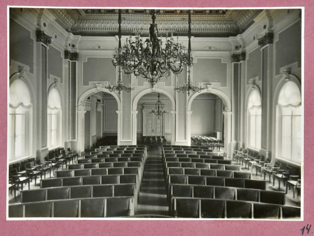 Latvijas PSR Augstākās padomes ēkas Komjaunatnes ielā 11 (tagad - Latvijas Republikas Saeimas ēka, Jēkaba ielā 11) sēžu zāles interjers. Skats no tribīnes. Augusta Roberta Pflūga un pirmā akadēmiski izglītotā latviešu arhitekta Jāņa Fridriha Baumaņa projekts. Sēžu zāles interjers veidots pēc Eižena Laubes 1922. gadā piedāvātā projekta pēc 1921. gada ugunsgrēka.