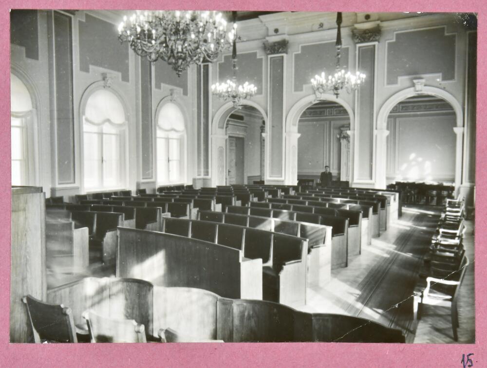 Latvijas PSR Augstākās padomes ēkas Komjaunatnes ielā 11 (tagad - Latvijas Republikas Saeimas ēka, Jēkaba ielā 11) sēžu zāles interjers. Skats no deputātu sektora. Augusta Roberta Pflūga un pirmā akadēmiski izglītotā latviešu arhitekta Jāņa Fridriha Baumaņa projekts. Sēžu zāles interjers veidots pēc Eižena Laubes 1922. gadā piedāvātā projekta pēc 1921. gada ugunsgrēka. Sakarā ar to, ka pēc 2. pasaules kara Latvijas PSR Augstākā padome pārņēma ēku, daļa no tās mākslinieciskajām vērtībām ir zudušas.