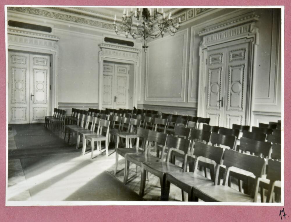 Latvijas PSR Augstākās padomes ēkas Komjaunatnes ielā 11 (tagad - Latvijas Republikas Saeimas ēka, Jēkaba ielā 11) zāles interjers. Augusta Roberta Pflūga un pirmā akadēmiski izglītotā latviešu arhitekta Jāņa Fridriha Baumaņa projekts.