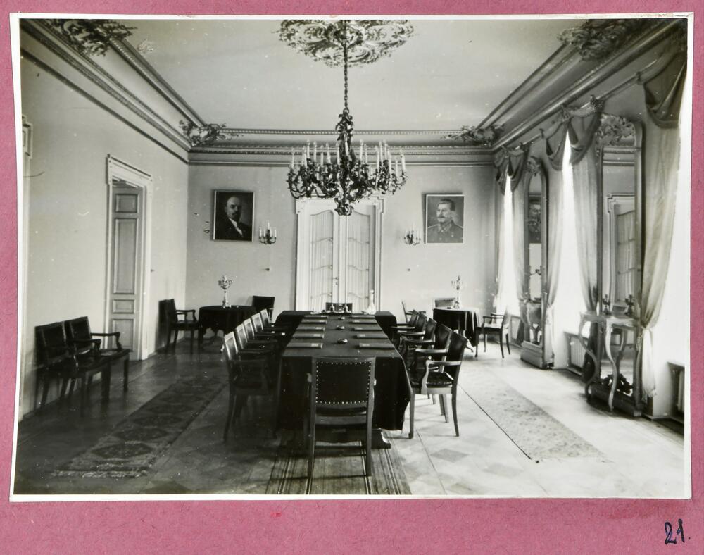 Latvijas PSR Augstākās padomes ēkas Komjaunatnes ielā 11 (tagad - Latvijas Republikas Saeimas ēka, Jēkaba ielā 11) Prezidija sēžu zāles interjers (tagad - Baltā zāle). Neorokoko stils. Rokaija spoguļi. Augusta Roberta Pflūga un pirmā akadēmiski izglītotā latviešu arhitekta Jāņa Fridriha Baumaņa projekts.