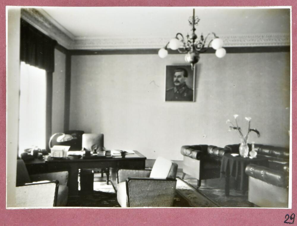 Latvijas PSR Augstākās padomes ēkas Komjaunatnes ielā 11 (tagad - Latvijas Republikas Saeimas ēka, Jēkaba ielā 11) Prezidija sekretāra kabinets. Augusta Roberta Pflūga un pirmā akadēmiski izglītotā latviešu arhitekta Jāņa Fridriha Baumaņa projekts.