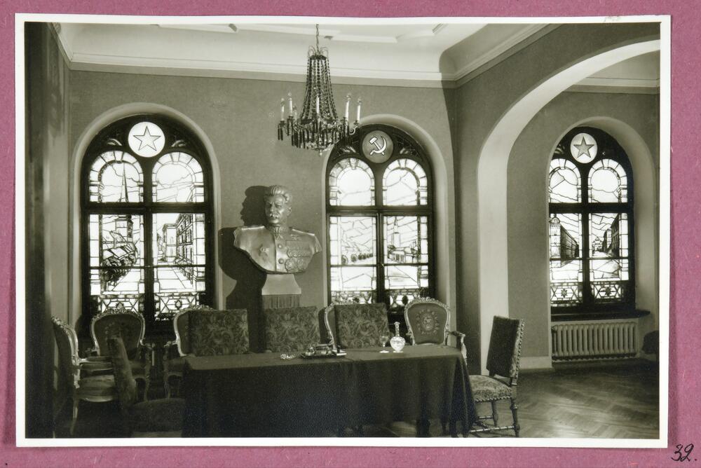 Latvijas PSR Augstākās padomes ēkas Komjaunatnes ielā 11 (tagad - Latvijas Republikas Saeimas ēka, Jēkaba ielā 11) Dienesta kabineta interjers (tagad - Sarkanā zāle). Augusta Roberta Pflūga un pirmā akadēmiski izglītotā latviešu arhitekta Jāņa Fridriha Baumaņa projekts.
