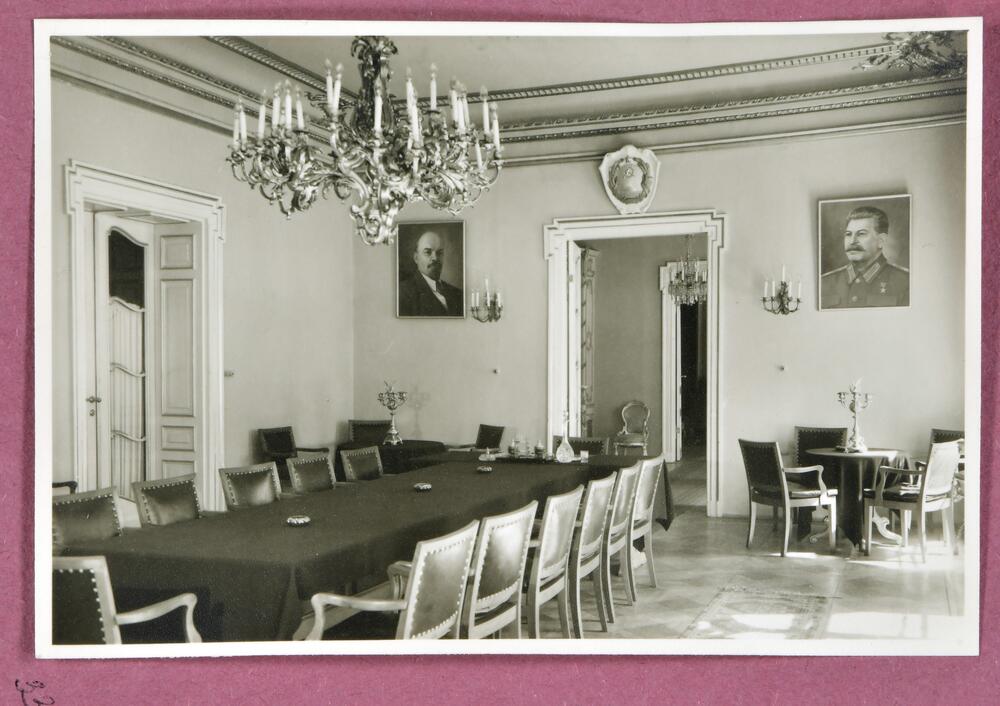 Latvijas PSR Augstākās padomes ēkas Komjaunatnes ielā 11 (tagad - Latvijas Republikas Saeimas ēka, Jēkaba ielā 11) Prezidija sēžu zāles interjers (tagad - Baltā zāle). Neorokoko stils. Augusta Roberta Pflūga un pirmā akadēmiski izglītotā latviešu arhitekta Jāņa Fridriha Baumaņa projekts.