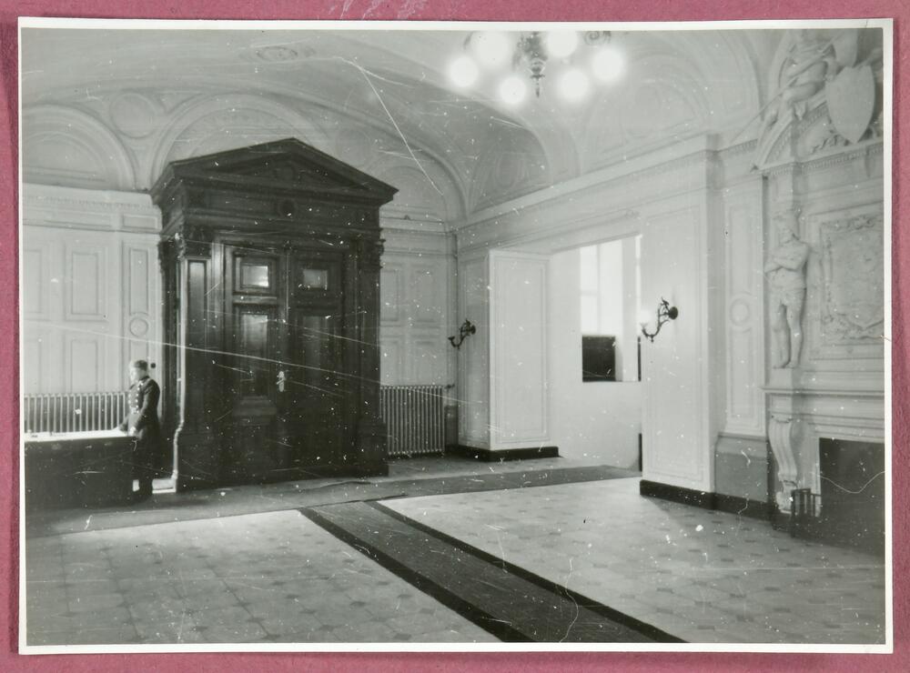 Latvijas PSR Augstākās padomes ēkas Komjaunatnes ielā 11 (tagad - Latvijas Republikas Saeimas ēka, Jēkaba ielā 11) vestibils. Augusta Roberta Pflūga un pirmā akadēmiski izglītotā latviešu arhitekta Jāņa Fridriha Baumaņa projekts. Celta eklektiskā historicisma stilā, bet pati ēkas eksterjera ideja aizgūta no Florences piļu renesanses arhitektūras. Ēkas zālēs pārstāvēti renesanses, baroka un gotikas stili.
