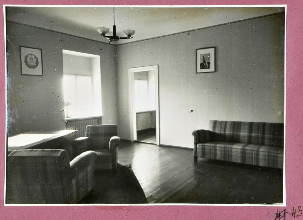 Latvijas PSR Augstākās padomes ēkas Komjaunatnes ielā 11 (tagad - Latvijas Republikas Saeimas ēka, Jēkaba ielā 11) vispārējās daļas kabinets. Augusta Roberta Pflūga un pirmā akadēmiski izglītotā latviešu arhitekta Jāņa Fridriha Baumaņa projekts.