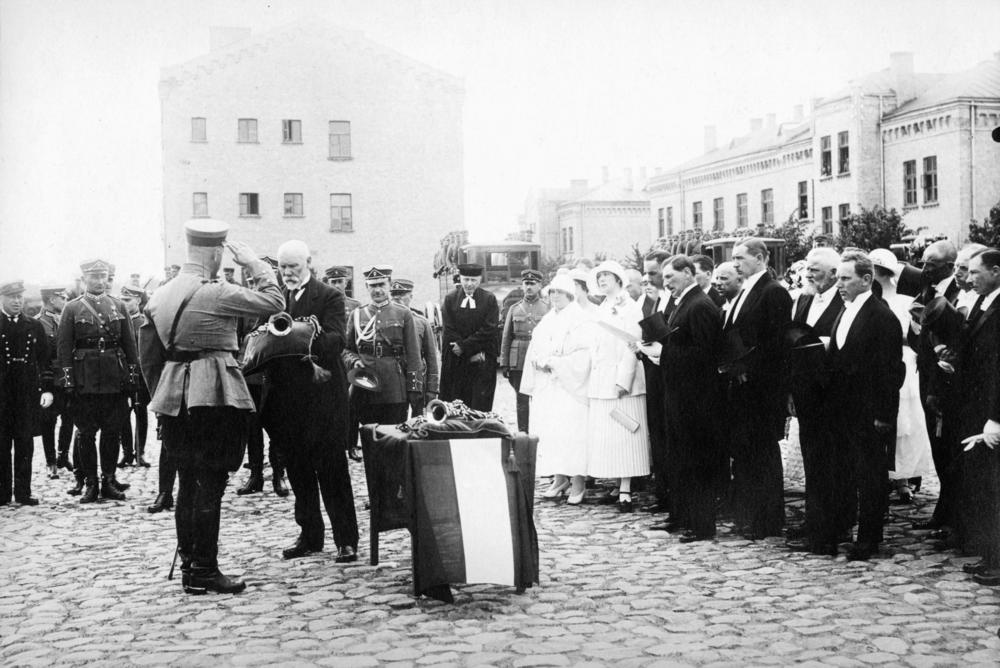 Smagā Artilērijas divīzijas komandieris pulkvežleitnants Pāvils Leskinovičs salutē, saņemot no Latvijas Valsts prezidentam Jāņa Čakstes pulkam pasniegtās taures. No kreisās puses pirmā rindā: 2. Latvijas armijas komandieris ģenerālis Pēteris Radziņš, 3. prezidenta adjutants Eduards Kuplais, 4. Armijas komandštāba priekšnieks, ģenerālis Jānis Buivids, 5. Rīgas garnizona draudzes mācītājs Jānis Eduards Tēriņš.