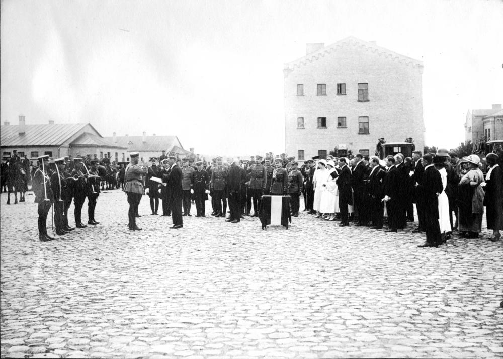 Latvijas armijas Smagās artilērijas pulka parāde tauru pasniegšanas ceremonijas laikā pulka komandieris pulkvežleitnants Pāvils Leskinovičs pieņem apsveikumus. No kreisās pirmā rindā: 5. Latvijas armijas komandieris ģenerālis Pēteris Radziņš, 6. Latvijas Valsts prezidents Jānis Čakste, 7. Ministru prezidents Voldemārs Zāmuels, 8. kara ministrs Fricis Birkenšteins, 9. adjutants Eduards Kuplais, aiz viņa - Latvijas armijas komandštāba priekšnieks, ģenerālis Jānis Buivids.