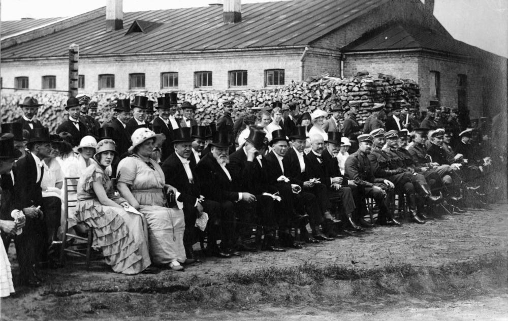 Latvijas Republikas valdības pārstāvji, Latvijas armijas virsnieki un ārvalstu militārie pārstāvji vēro Latvijas armijas Smagās artilērijas pulka parādi un sagatavotos priekšnesumus Smagās artilērijas pulka tauru pasniegšanas ceremonijas ietvaros. No kreisās puses pirmā rindā sēž: 8. Ministru prezidents Voldemārs Zāmuels, 9. Latvijas Valsts prezidents Jānis Čakste, 10. kara ministrs Fricis Birkenšteins, 11. Latvijas armijas komandieris ģenerālis Pēteris Radziņš,12. Latvijas armijas komandštāba priekšnieks, ģenerālis Jānis Buivids, 13. Rīgas garnizona komandieris, ģenerālis Kārlis Goppers u.c.