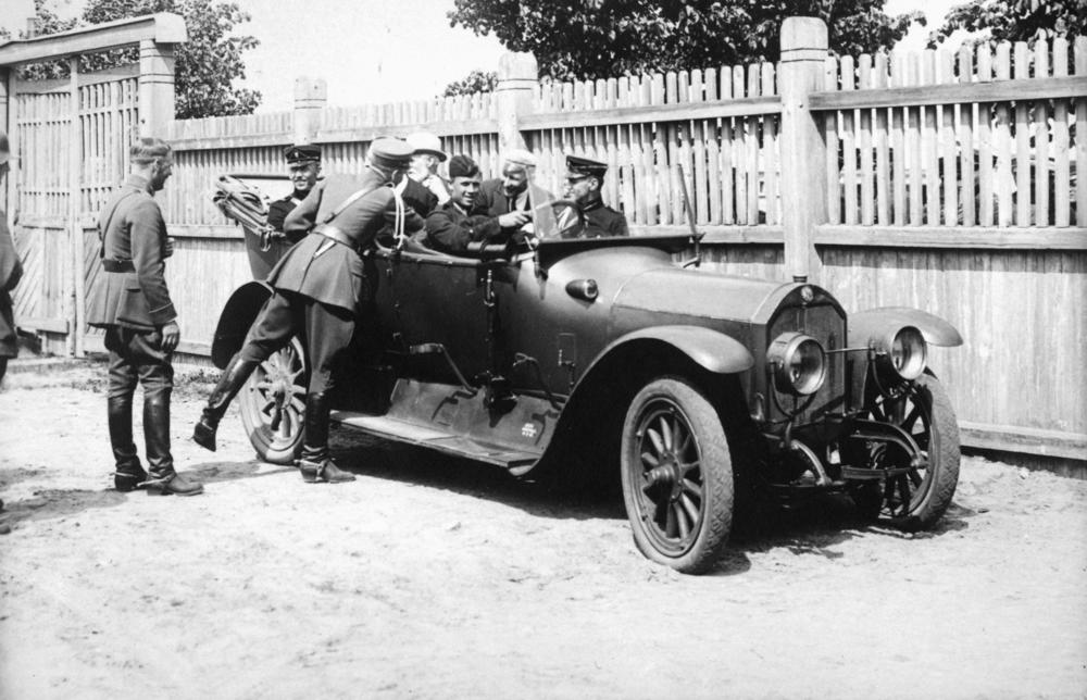 Latvijas Republikas valdības pārstāvji un Latvijas armijas virsnieki pie vieglās automašīnas atvadās svētku noslēgumā no Smagās artilērijas divīzijas komandieriem.