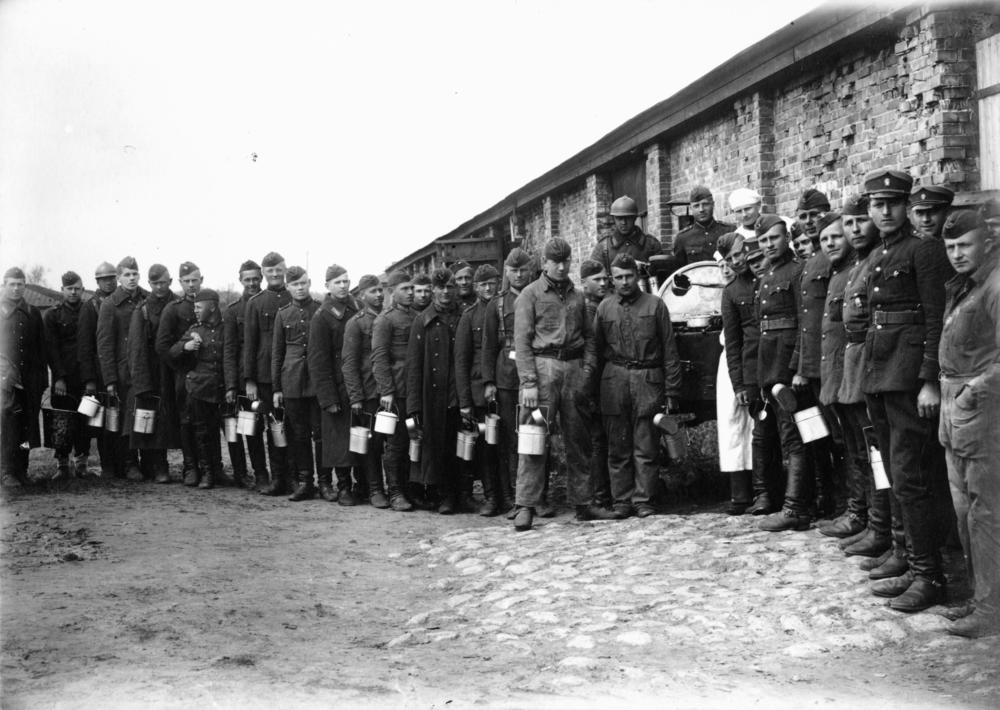 Latvijas armijas Smagās artilērijas pulka karavīri pirms pusdienu izdalīšanas.