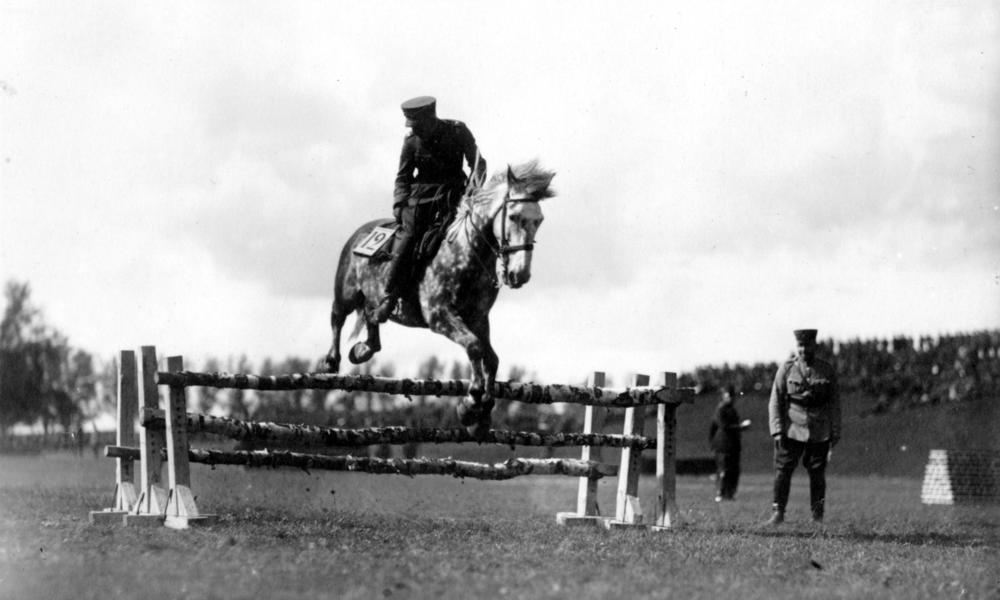 Latvijas armijas Smagās artilērijas pulka jāšanas sacīkšu laikā šķēršļu pārvarēšanas disciplīnā karavīrs uz zirga pārlec pāri koka barjerai.