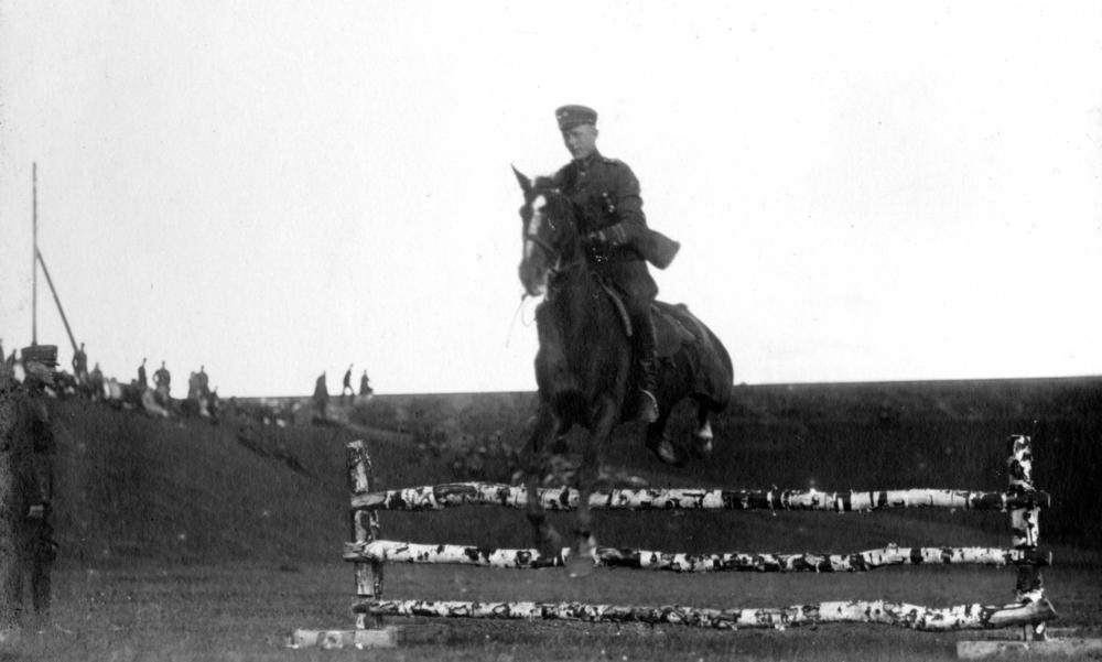 Latvijas armijas Smagās artilērijas pulka jāšanas sacīkšu laikā šķēršļu pārvarēšanas disciplīnā karavīrs uz zirga pārlec pāri koka barjerai.