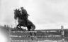 Latvijas armijas Smagās artilērijas pulka jāšanas sacīkšu laikā šķēršļu pārvarēšanas disciplīnā karavīrs uz zirga pārlec pāri koka barjerai.