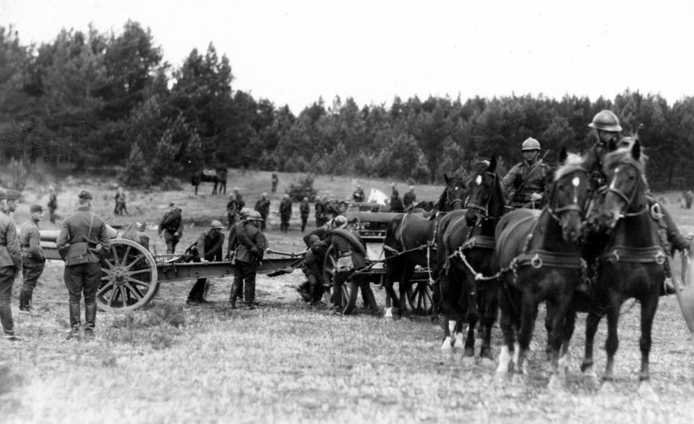 Latvijas armijas Smagās artilērijas pulka karavīri pārgājiena laikā velk zirgu pajūgos lielgabalus.