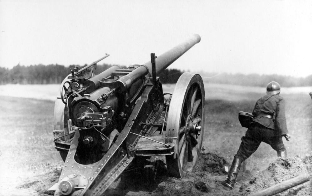 Latvijas armijas Smagās artilērijas pulka karavīri šauj no lielgabala mācību laikā.