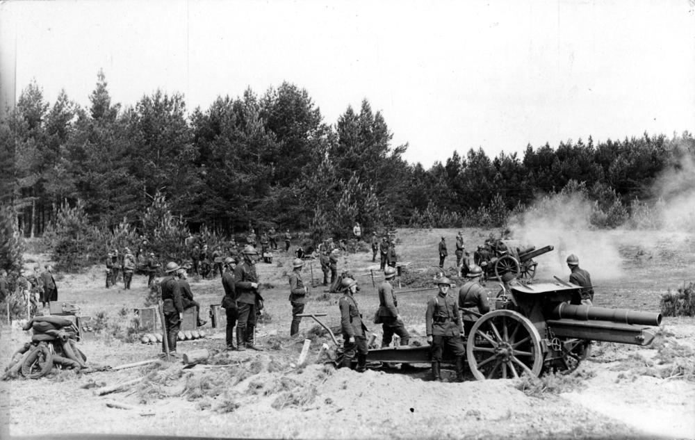 Latvijas armijas Smagās artilērijas pulka karavīri šauj no lielgabala mācību laikā.