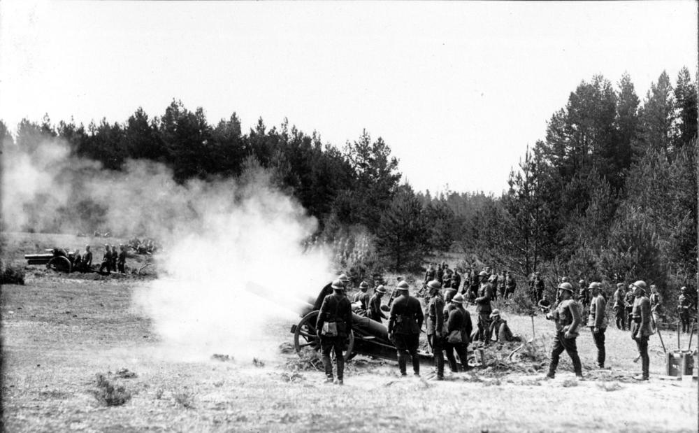 Latvijas armijas Smagās artilērijas pulka karavīri šauj no lielgabala mācību laikā.