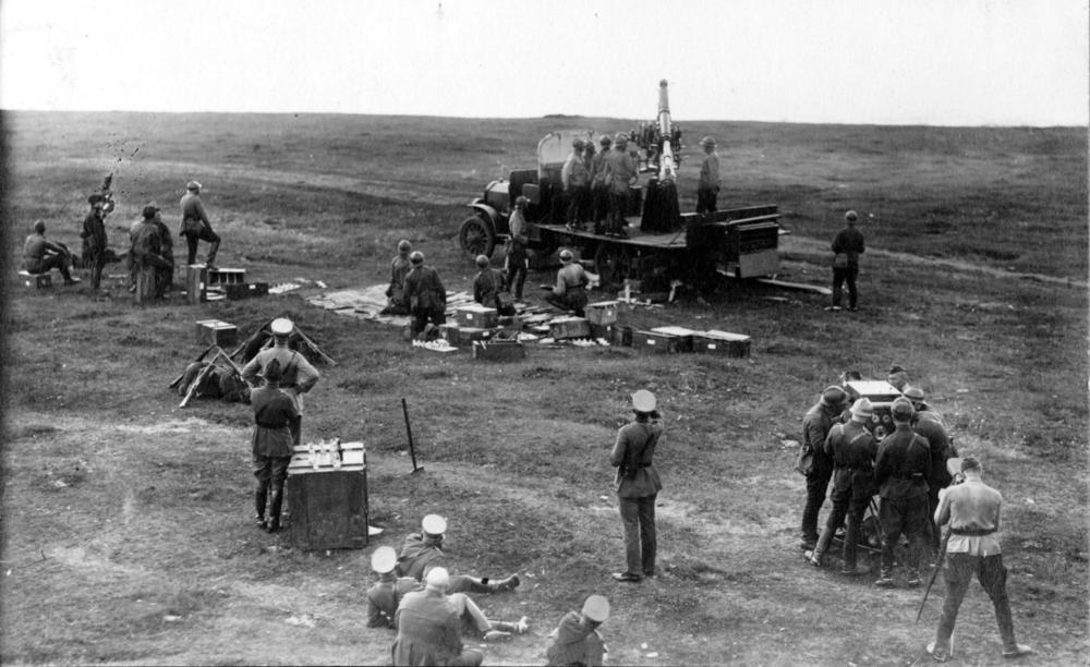 Latvijas armijas Smagās artilērijas pulka mācībās šaušana no lielgabala.