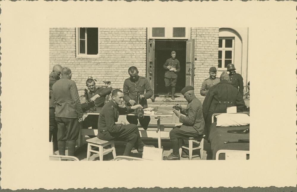 Latvijas armijas 3. Jelgavas kājnieku pulka karavīri militāro apmācību laikā aplūko ložmetēju.