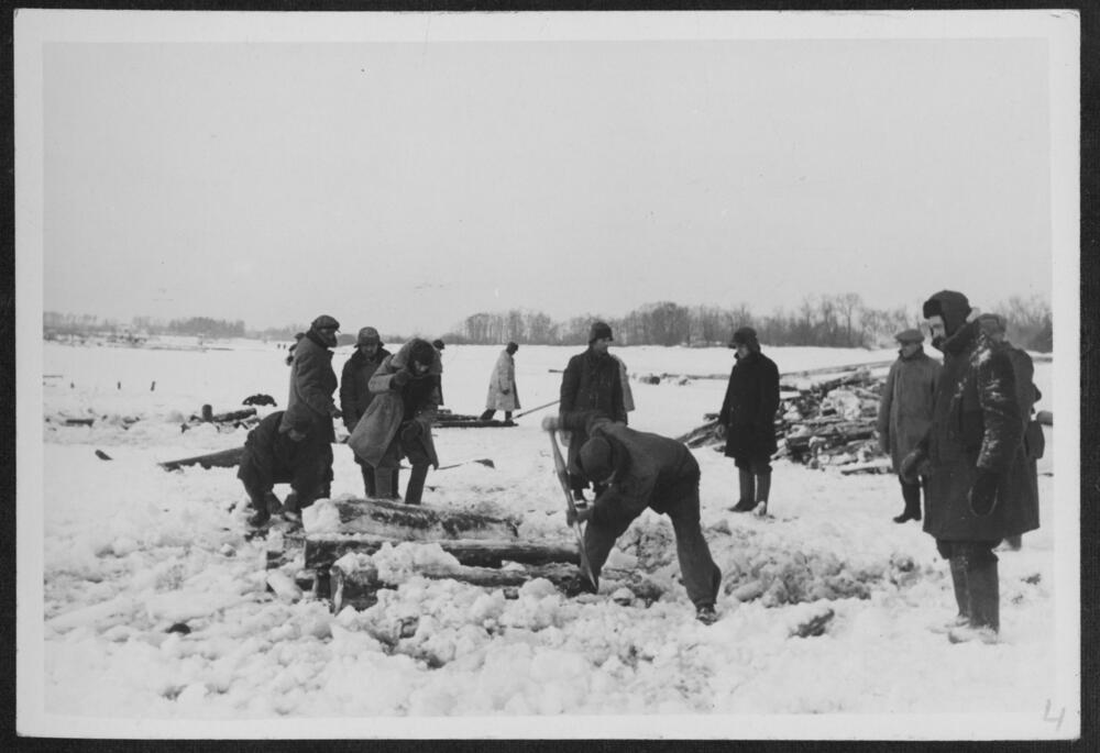 Strādnieki ar laužņiem atbrīvo Lielupes upē iesalušos kokmateriālus.