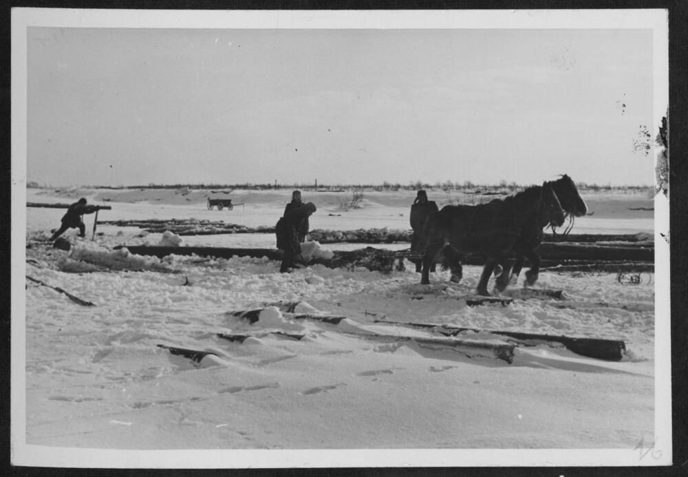 Strādnieki ar zirgu palīdzību no Lielupes upes izceltos baļķus nogādā krastā.