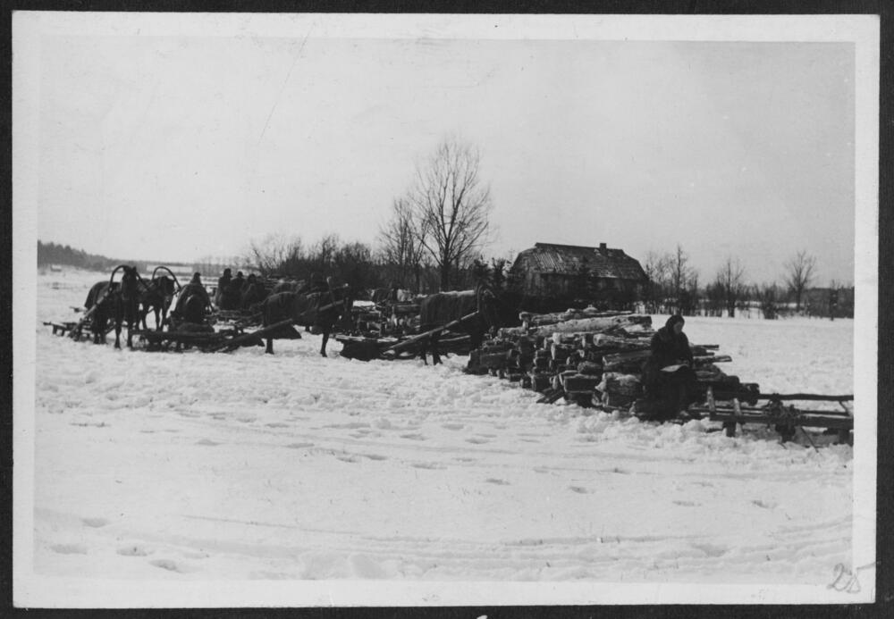 Zirgu pajūgi ar kokmateriāliem nogādā tos Lielupes upes krastā. Priekšplānā baļķu krāvums.