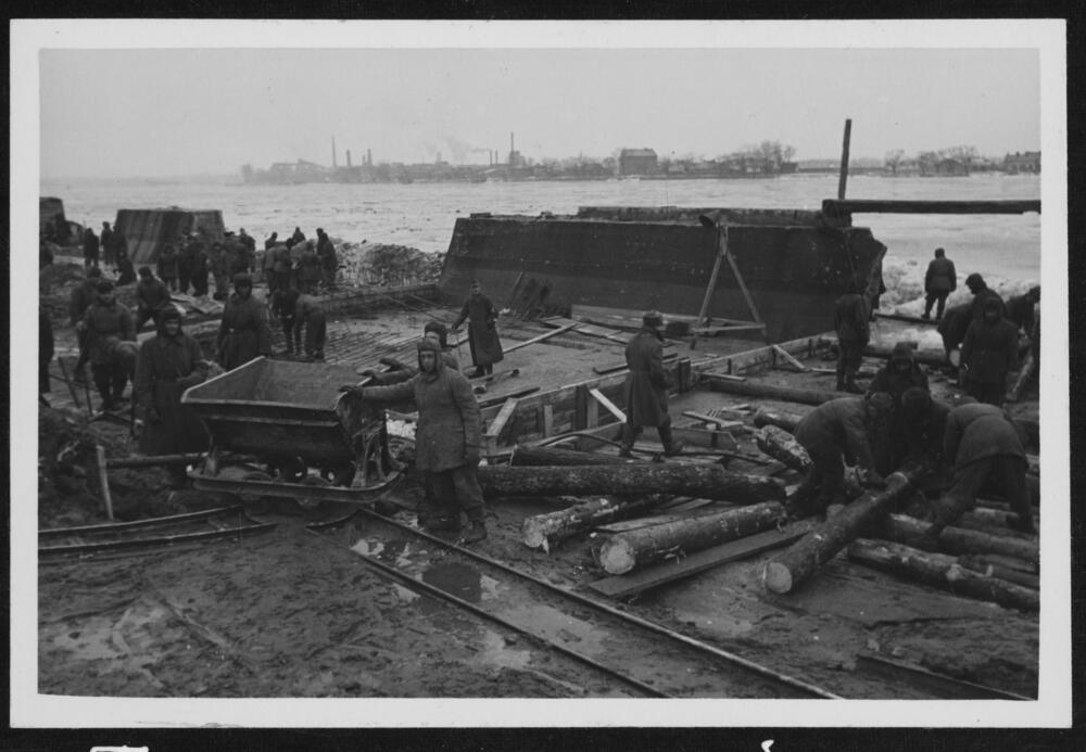 Daugavas krastmalas atjaunošana un nostiprināšana, pret ledus sanesumu radītajiem bojājumiem, Rīgas ostas teritorijā. Strādnieki pie vagonetes veido balstu stiprinājumus no koka bluķiem.