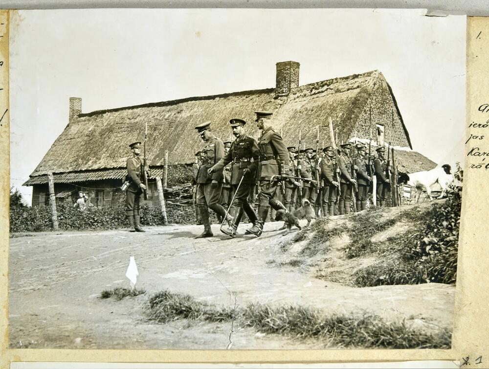 Lielbritānijas un Īrijas Apvienotās Karalistes karaļa Džordža V ierašanās Kanādas karaspēka daļā Pirmā pasaules kara laikā. Karavīri sveic karali.