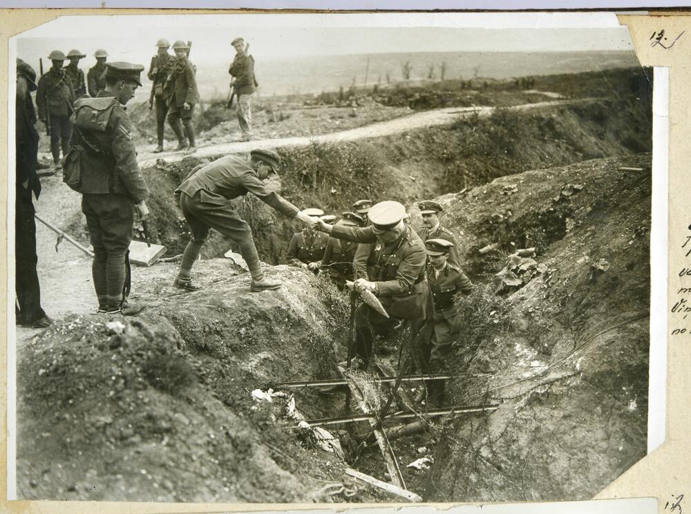 Kanādas kājnieki un Kanādas milicijas un aizsardzības ministrs, ģenerālmajors Semjuels Hjūzs (Semjuel Hughes) apmeklē ieņemtos vācu ierakumus pie Sommas Pirmā pasaules kara laikā.