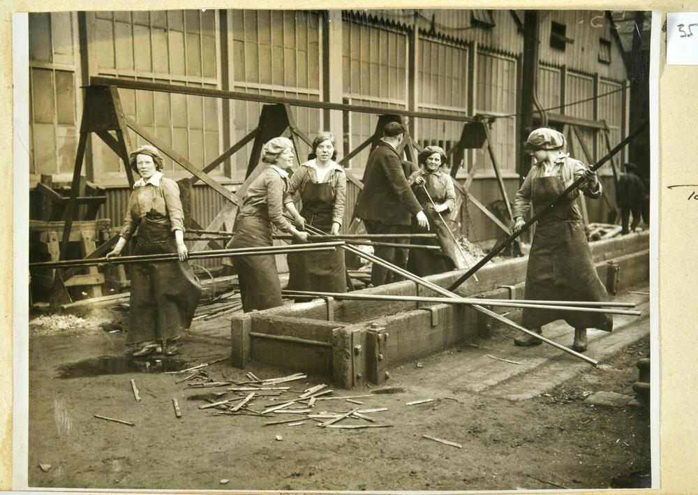 Munīcijas rūpnīcas teritorijā strādnieces kopā ar darbu vadītāju darba procesā (iespējams Karaliskā arsenāla rūpnīca Vūlvičā, Londonas dienvidaustrumos (The Royal Arsenal, Woolwich)).