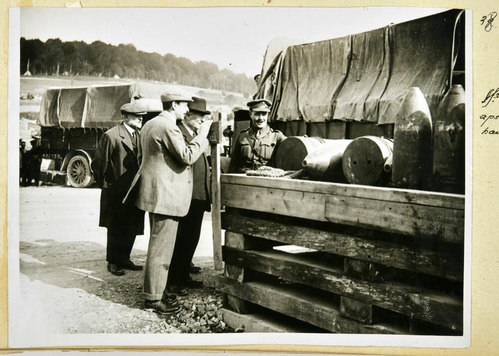Civilām personām britu karavīrs atrāda lielās haubices lādiņu čaulas Pirmā pasaules kara laikā.