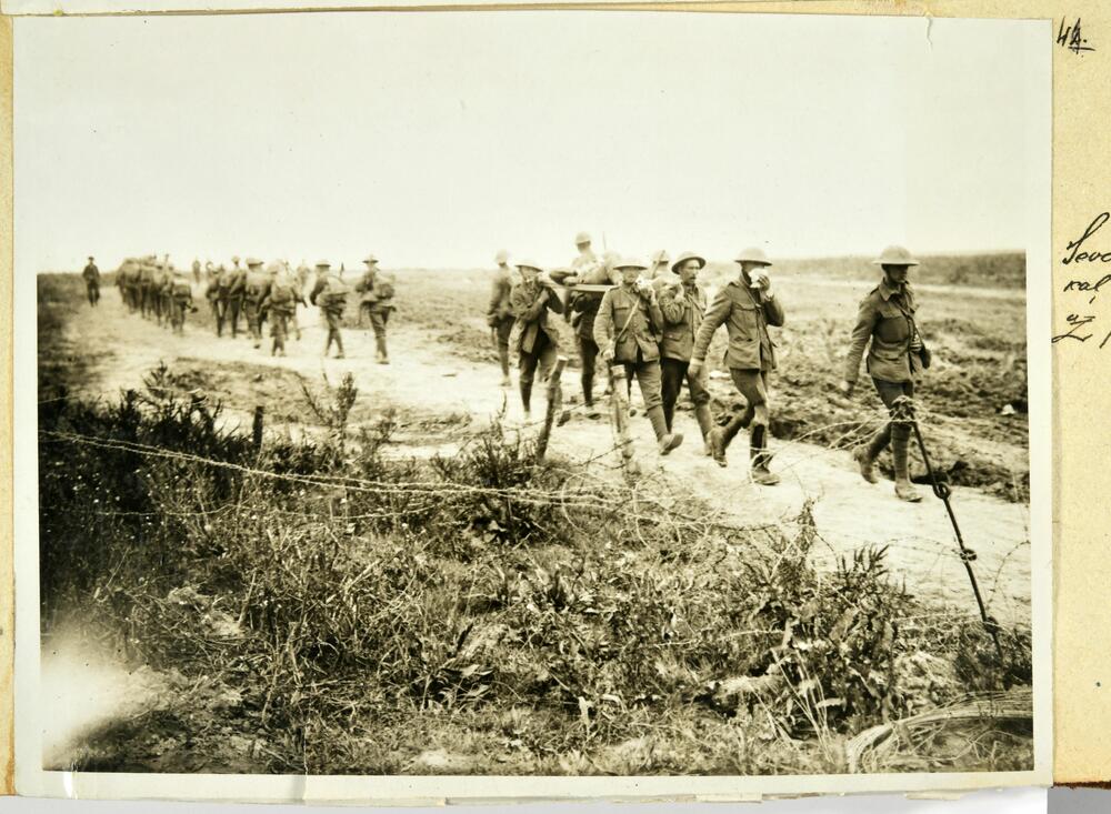 Pirmā pasaules kara laikā pēc kaujas karavīri uz lielceļa, daļa pārvietojas uz karadarbības lauku, daļa atpakaļ nesot ievainoto nestuvēs.