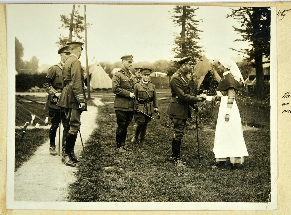 Lielbritānijas un Īrijas Apvienotās Karalistes karalis Džordžs V sasveicinās ar kara laukā izvietotās slimnīcas priekšnieci Pirmā pasaules kara laikā.