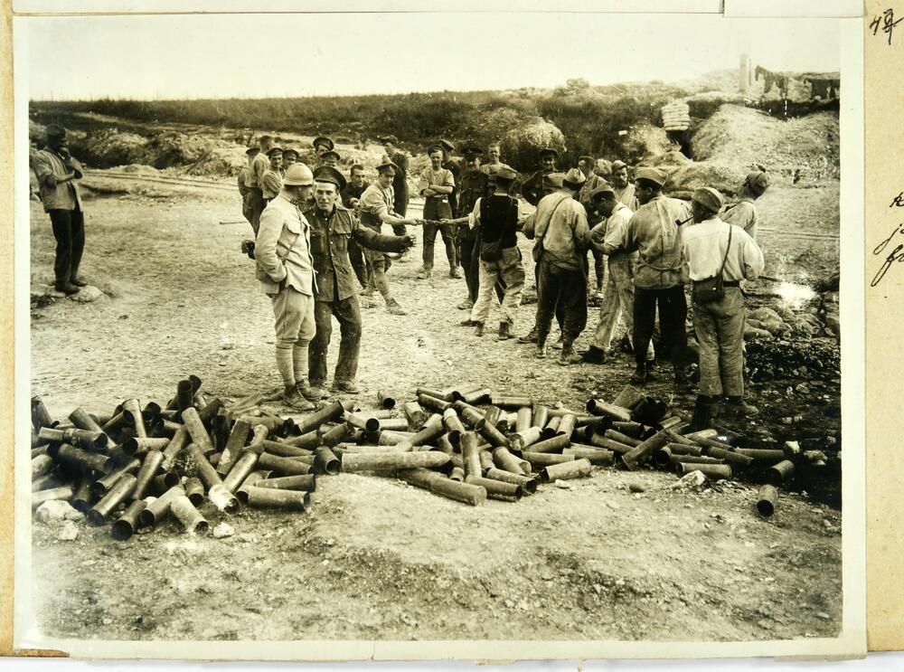 Britu un franču artilērijas karavīri sarīkotās virves vilkšanas sacensībās Pirmā pasaules kara laikā.