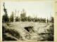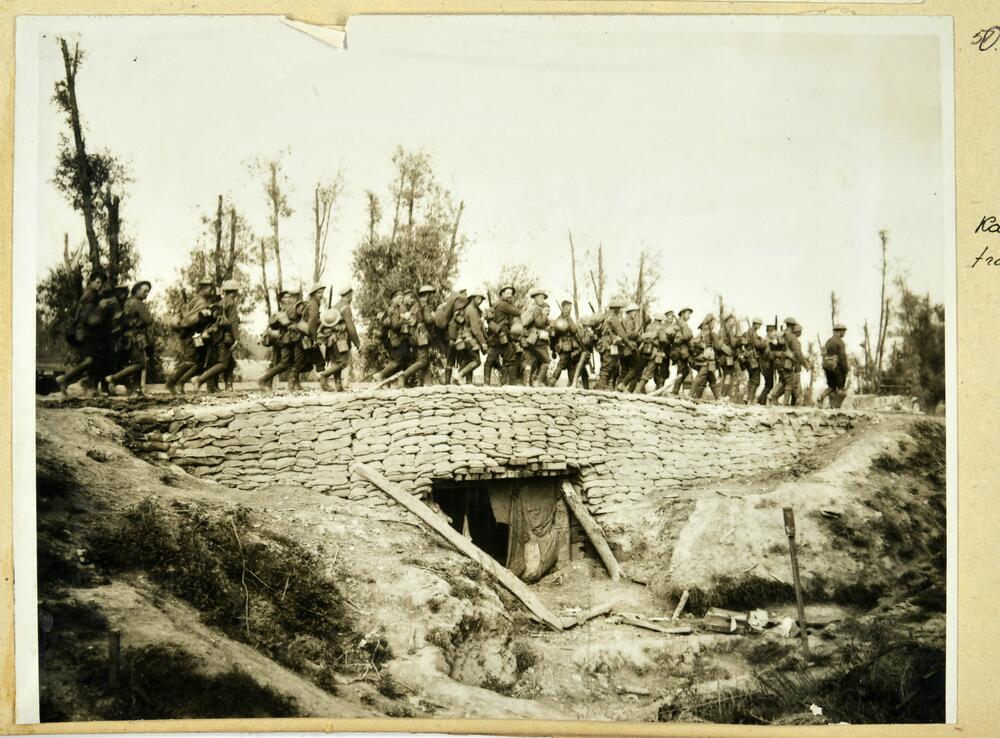 Pirmā pasaules kara laikā karavīru kolonna pilnā ekipējumā šķērso tiltu, kas izveidots no maisiem pāri tranšejām.