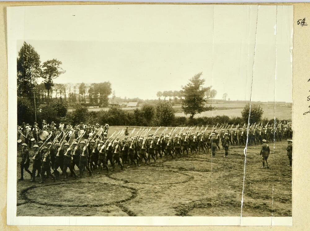 Kanādas kājnieki Kanādas milicijas un aizsardzības ministra, ģenerālmajora Semjuela Hjūza (Semjuel Hughes) pavadīti dodas uz frontes līniju Pirmā pasaules kara laikā.