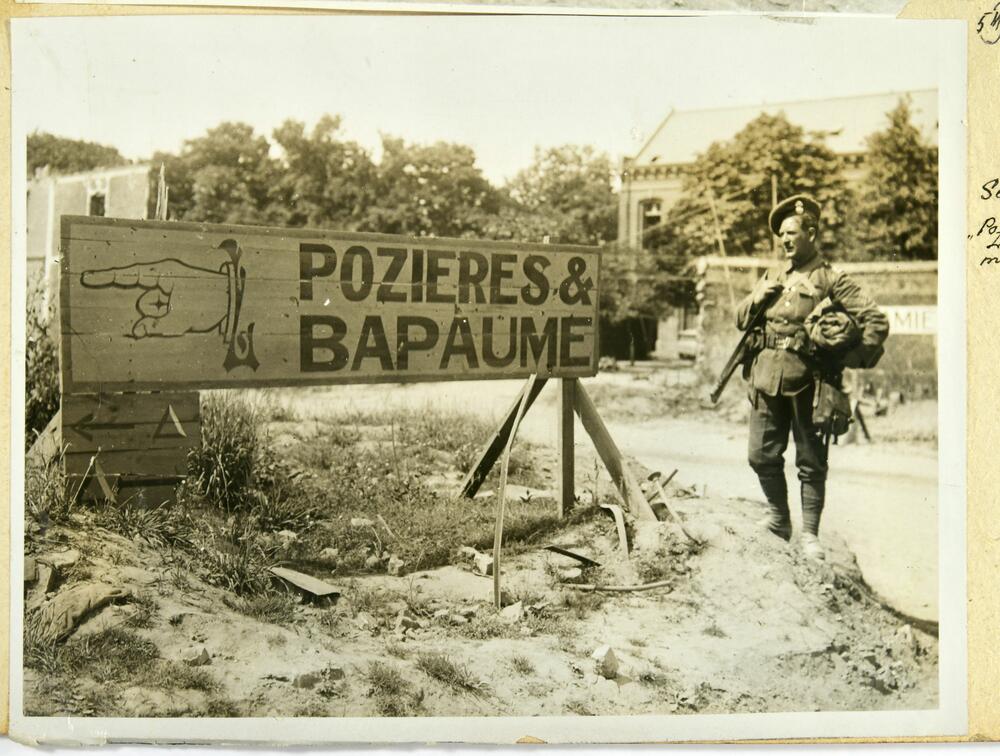 Pirmā pasaules kara laikā karavīrs pie norādes "Pozieres&Bapaume".(piezīme albumā: Sekmju pazīme: "Pozieris jau pieder mums").