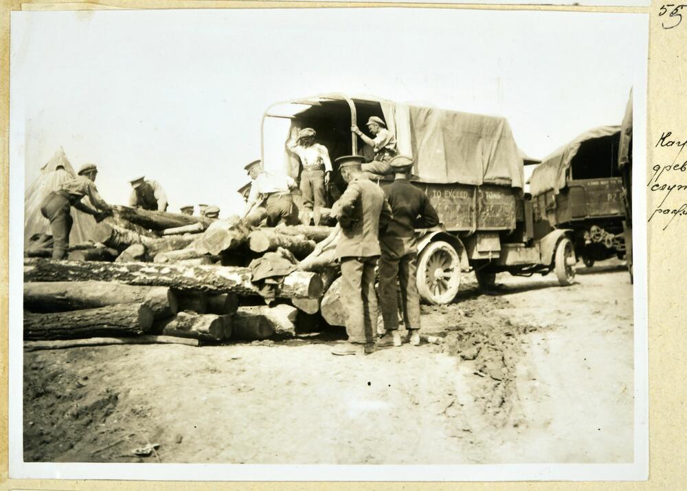 Pirmā pasaules kara laikā karavīri kravas automašīnās krauj baļķus.