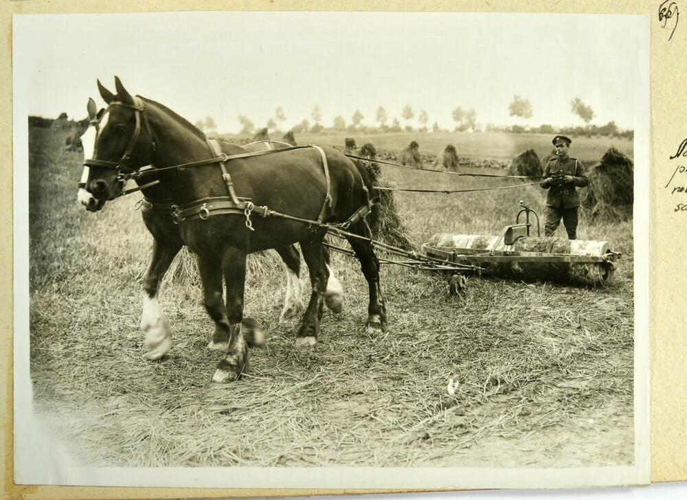 Pirmā pasaules kara laikā karavīrs vada zirgus, kuri velk pa nopļautu labības lauku metāla rulli.