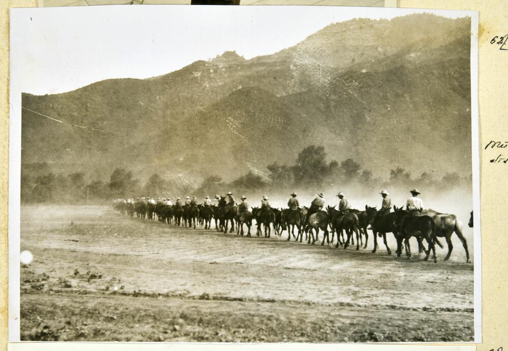 Karavīri mūļu baru ved uz dzirdītavu Pirmā pasaules kara laikā.