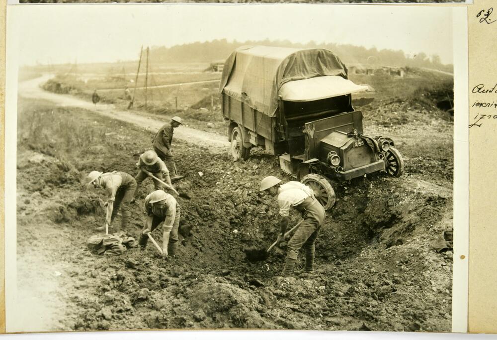 Kravas automašīna iebrauca mīnas radītā bedrē Pirmā pasaules kara laikā.