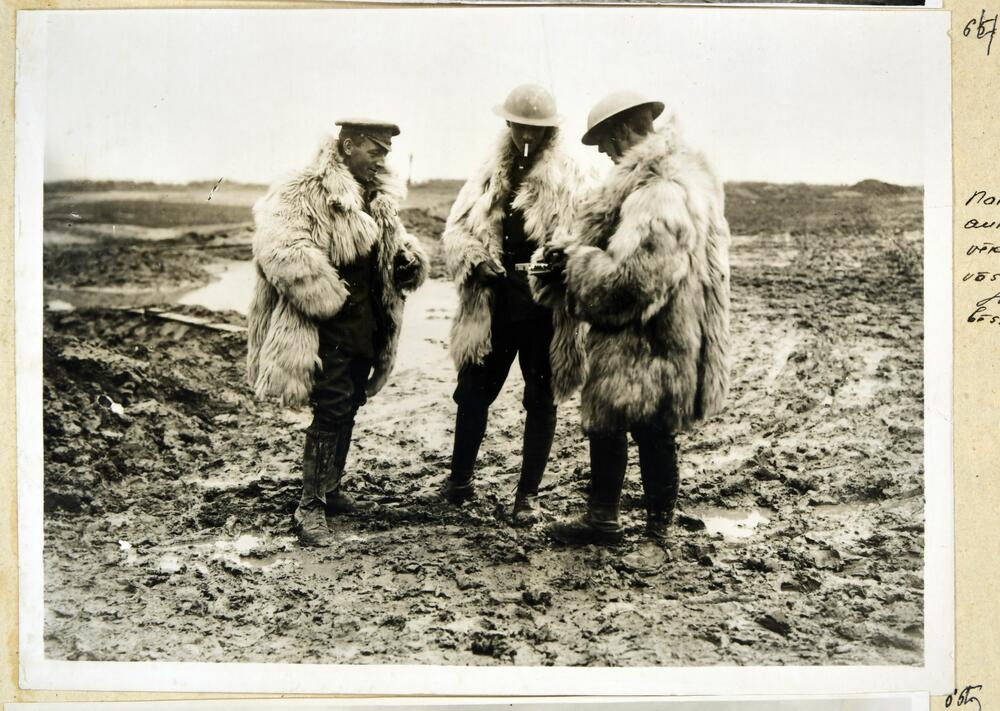 Pirmā pasaules kara laikā karavīri speciālos ziemai domātos kažokos uz lauka. (piezīme albumā - naktis paliek auksta un karavīri ģērbjas savās ziemas drēbēs)