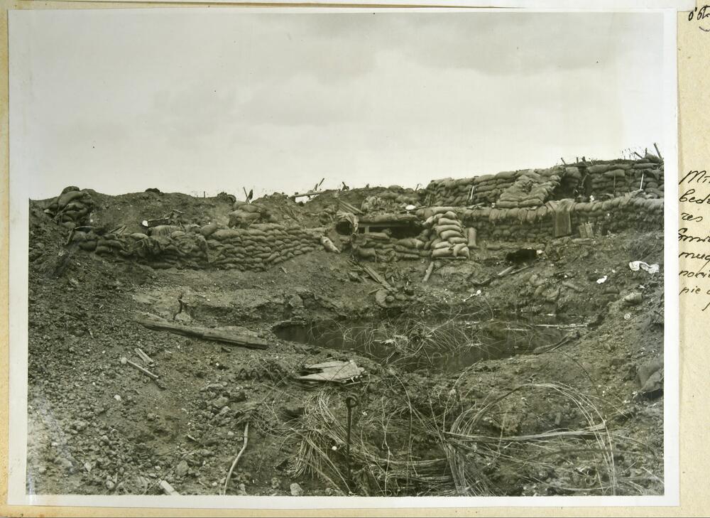 Pirmā pasaules kara laika kaujās mīnas izrautā bedre un smilšu maisu krāvumi aizmugurējā plānā. Iespējams nocietinājums pie Lippe upes (Reinas-Vestfāles apgabals).