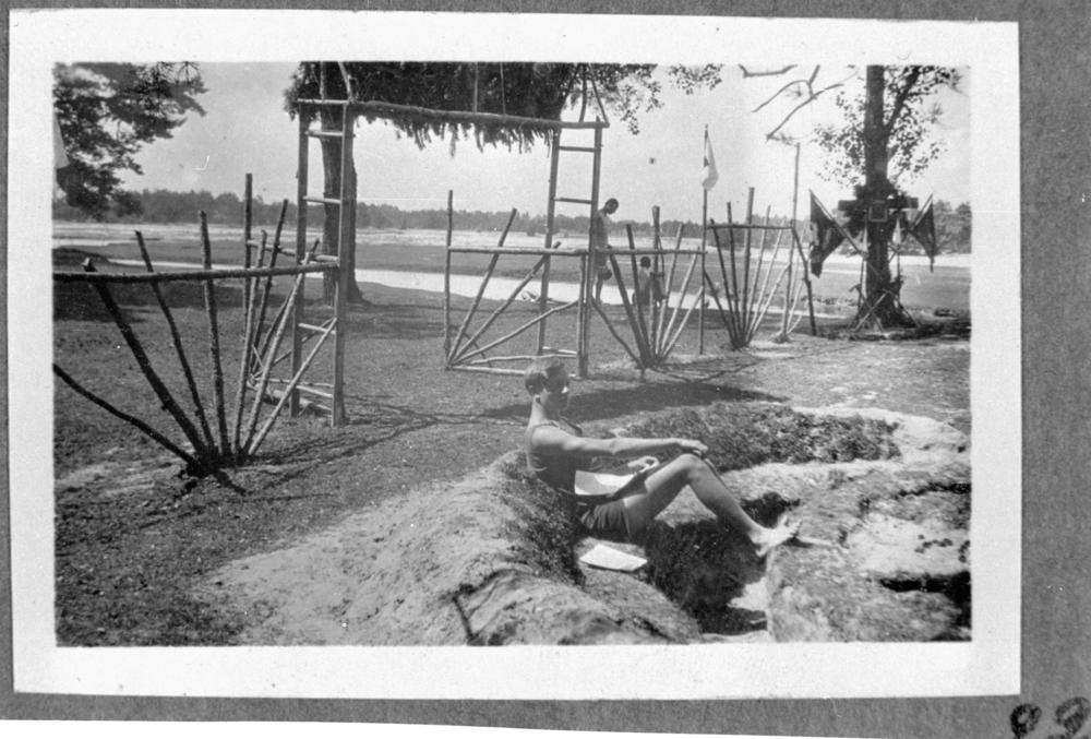 Nometnes Buļļos koka konstrukcijas ieejas vārti. Priekšplānā skauts sēž no zemes izveidotā solā.