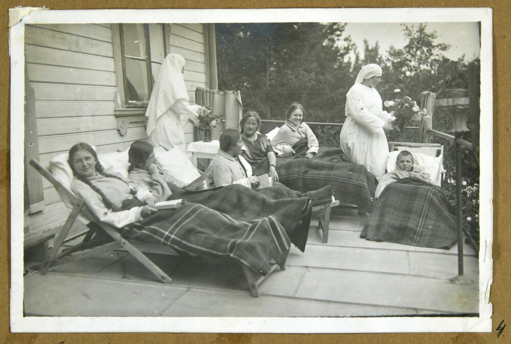 Latvijas Sarkanā Krusta Cēsu sanatorijas privātajiem slimniekiem paredzētajā ēkā medicīnas māsas uz terases aprūpē atpūtas krēslos gulošos dažāda vecuma bērnus.