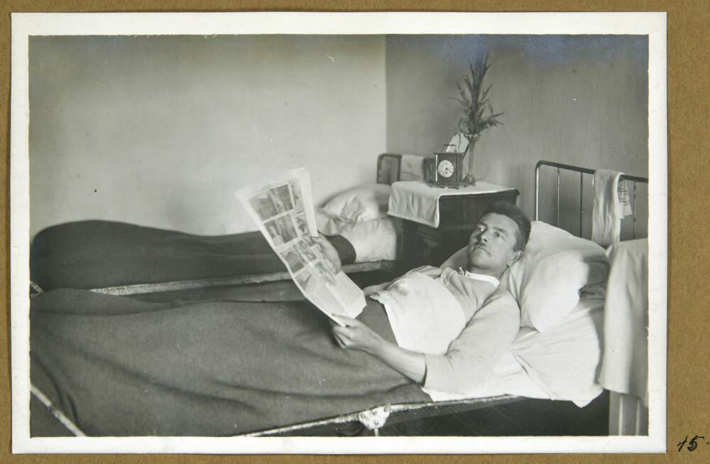 Latvijas Sarkanā Krusta Cēsu sanatorijas palātā Latvijas Brīvības cīņu dalībnieks, kara invalīds gultā lasa laikrakstu.